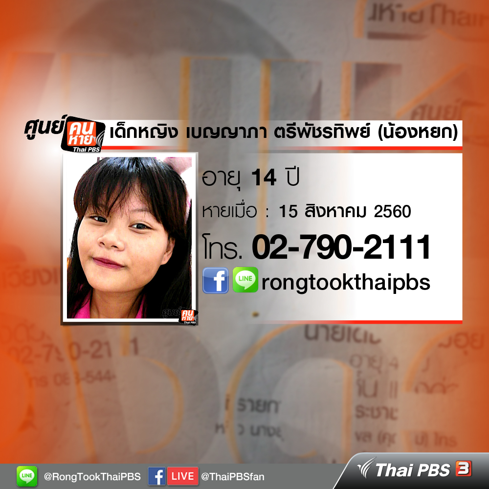 ด.ญ. เบญญาภา ตรีพัชรทิพย์ หรือ น้องหยก อายุ 14 ปี สูงประมาณ 165 เซนติเมตร มีโรคประจำตัว คือไบรโพล่า หายออกจากบ้านเมื่อวันที่ 15 สิงหาคม 2560 เวลาประมาณ 15.00 น. วันที่ออกจากบ้านใส่เสื้อยืดคอกลมสีน้ำเงิน กางเกงขาสั้น และขอเงินจากแม่บอกว่าจะไปหาเพื่อนชื่อแพร แต่สุดท้ายไม่ได้ไปหาเพื่อน ตอนนี้แม่เป็นห่วงมากเพราะน้องหยกมีโรคประจำตัว คือ ไบรโพล่า แม่กลัวว่าน้องจะถูกล่อลวงไปเพราะน้องมีอาการอารมณ์ไม่ปกติ และเชื่อคนง่าย ล่าสุดวันที่ 17-8-2560 มีผู้พบเห็นอยู่ที่วัดหนามแดง ต.บางแก้ว อ.บางพลี จ.สมุทรปราการ แต่ไปตามก็ไม่พบแจ้งความแล้วที่ สภ.บางแก้ว จ.สมุทรปราการ