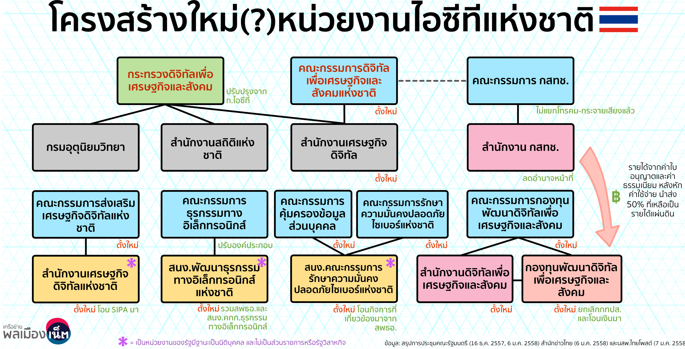 สรุปโครงสร้างและอำนาจหน้าที่ของหน่วยงานที่เกี่ยวกับข้อมูลข่าวสารและไอซีที ทั้งที่จะตั้งใหม่และที่จะปรับปรุงจากเดิม จากข้อมูลเช้าวันที่ 7 ม.ค. 2558 (ดูข้อสังเกตเบื้องต้นเกี่ยวกับการเปลี่ยนแปลงนี้ได้ที่ด้านท้ายของบทความ)